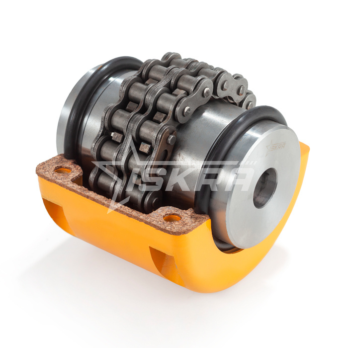 Муфта цепная под расточку ISCC6020 ISKRA состоит из двух полумуфт с зубчатыми венцами, соединённых роликовой цепью. Используется для передачи крутящего момента путем соединения валов в механизмах. Способна компенсировать несоосность до 2 градусов за счёт своей конструкции.